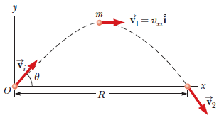 \[ \textbf r_1 =\frac{R}{2}\hat{ \textbf x } + h \hat{ \textbf y } \\ \ \\ \ \\ \ = \Bigg( \frac{v_0^2 \cos \theta \sin \theta}{g}\Bigg) \hat{ \textbf x } + \Bigg(\frac{(v_0 \sin \theta)^2}{2g} \Bigg) \hat{ \textbf y } \] \[\textbf v = v_{x} \hat {\textbf x} + v_y \hat{ \textbf y}\] Does any of this look familiar? (I'm going at a snail's pace because my brain is slowz)