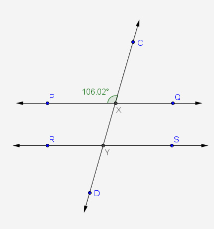 Transversal CD cuts parallel lines PQ and RS at points X and Y as shown in the diagram. If m<CXP = 106.02°, what is m<SYD? http://cdn.ple.platoweb.com/PCAP-ASSETS-PROD/db2aefc5dd3c49f4b5f8588caeb3abfc