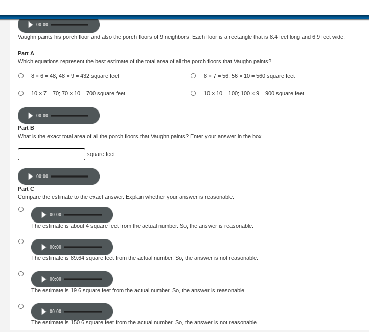 old question, answering so this can be closed part A) area = length * width. however, it's asking for an estimate, so round each dimension to the nearest integer, then calculate area = length * width. part B) there are 10 total porches (vaughn's + 9 neighbors). however, be very careful here - it's asking for an exact answer here. so you would go back to the original dimensions of 8.4 and 6.9, multiply them to get area, then multiply by 10 part C) subtract the estimated area and the total area (take the positive result if negative) to see how far the estimate is.