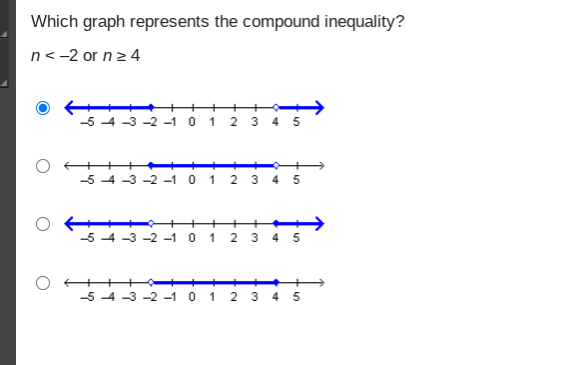 Which graph represents the compound inequality? n < –2 or n ≥ 4