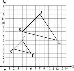 Triangle J′K′L′ shown on the grid below is a dilation of triangle JKL using the origin as the center of dilation: Two triangles are drawn on a grid. First triangle has vertices J 8 and 12, K 4 and 8, L 12 and 6. Image triangle has vertices J prime 4 and 6, K prime 2 and 4, L prime 6 and 3. Which scale factor was used to create triangle J′K′L′? 4 1/4 2 one half