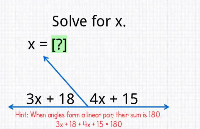 \( \color{red}{3x} + \color{orange}{18} + \color{red}{4x} + \color{orange}{15} = 180\) \( \color{red}{7x} + \color{orange}{33} = 180\)