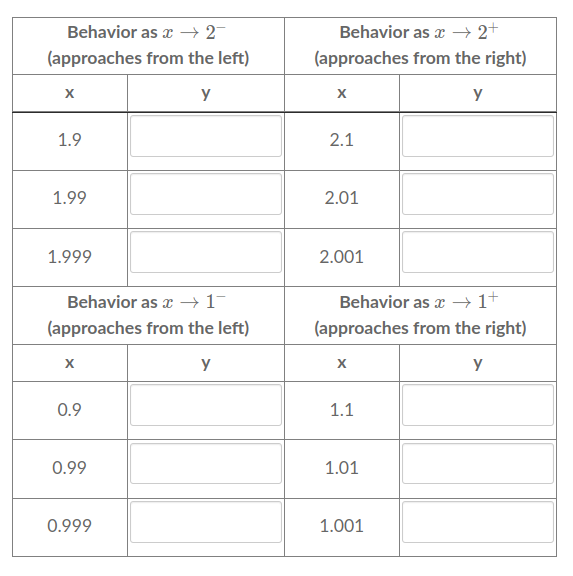 For each x-value, plug that value into the function, and fill out the result So, for the first one, you'd plug in x = 1.9 into y=(x−2)/(x−1)(x−2), calculate the result, and report the result in the box, rounded to 5 decimal places the point is to calculate these values (1.9, 1.99, 1.999, etc.) to see how the function behaves as x gets closer and closer to 2 from the left. same logic with the rest of the tables.