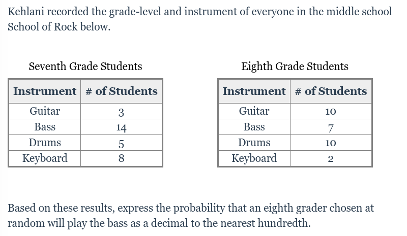 To find the probability that an eighth grader chosen at random will play the bass, we need to divide the number of eighth-grade bass players by the total number of eighth graders: Number of eighth-grade bass players = 7 Total number of eighth graders = 10 + 7 + 10 + 2 = 29 So the probability that an eighth grader chosen at random will play the bass is: 7/29 ≈ 0.24 Rounding to the nearest hundredth, the probability is approximately 0.24.