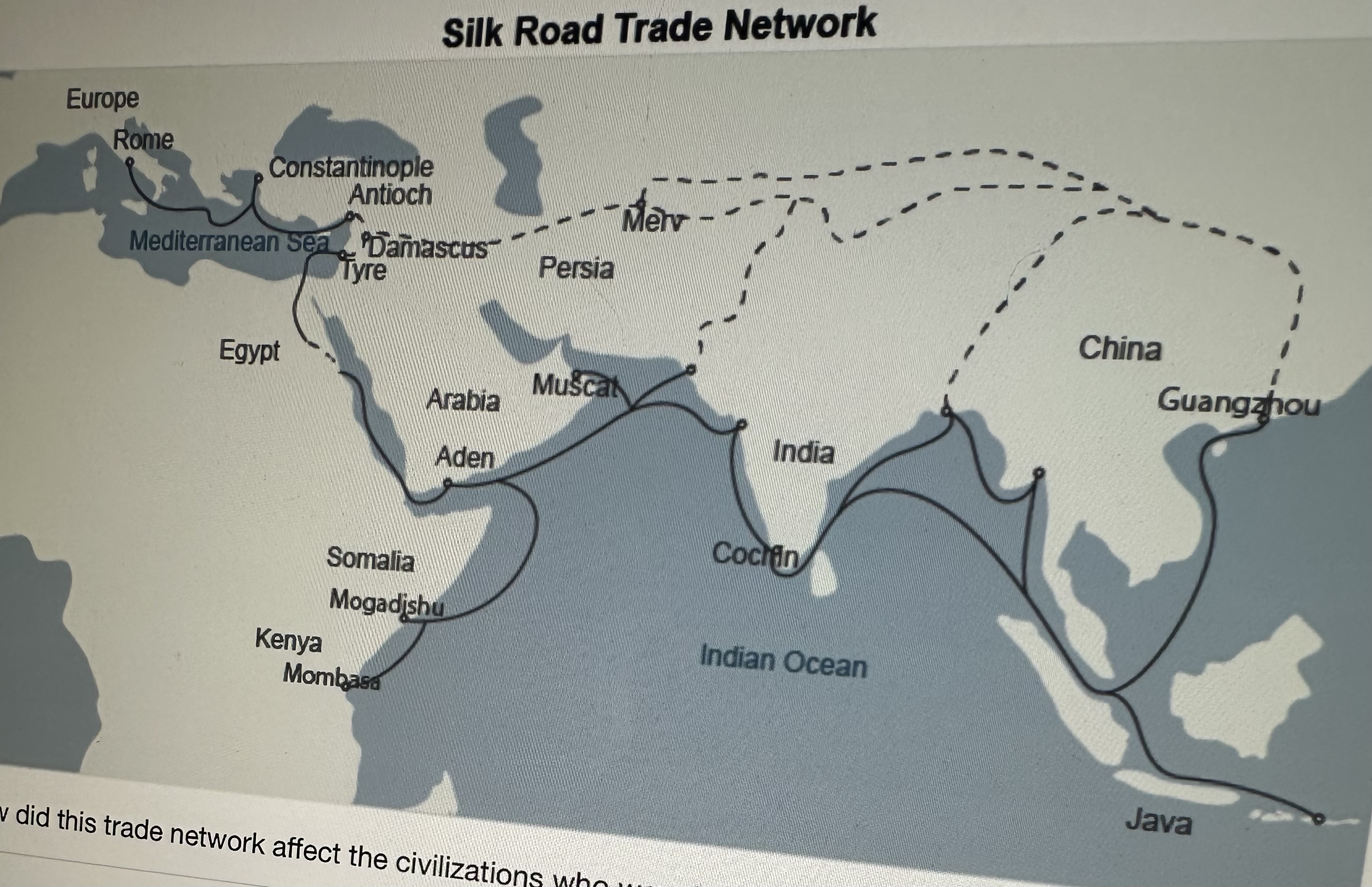 Use the map to answer the question. Silk Road Trade Network Europe Consiliaritonople Antioch Meterana Vahastus yre Arabia Persia China Egypt Musc Aden India Guangzhou Sonulia Mogadish Cod Kanja Monty Indian Ocean Java How did this trade network affect the civilizations who were involved in it? A. it led the leaders of their governments to establish isolationist policies. B. It provided them access to resources not available in their environments. C. It contributed to the rapid decline of their economies. D. It helped to protect them from the spread of disease.