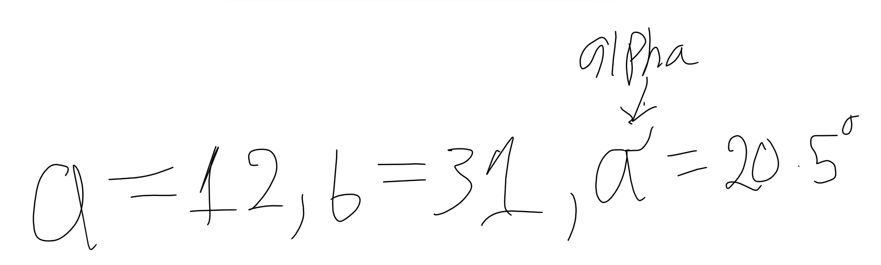 For anyone who cant read it: A = 12, B = 31, α (alpha) = 20.5 degrees (do correct me if I'm wrong) Also lets try to be nice on the post, regardless of how someone's handwriting looks.