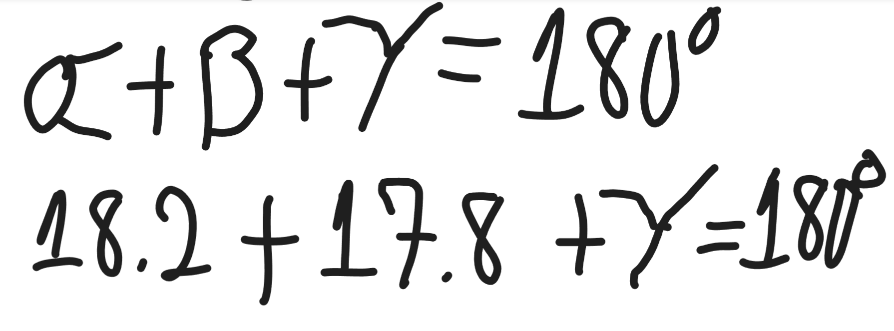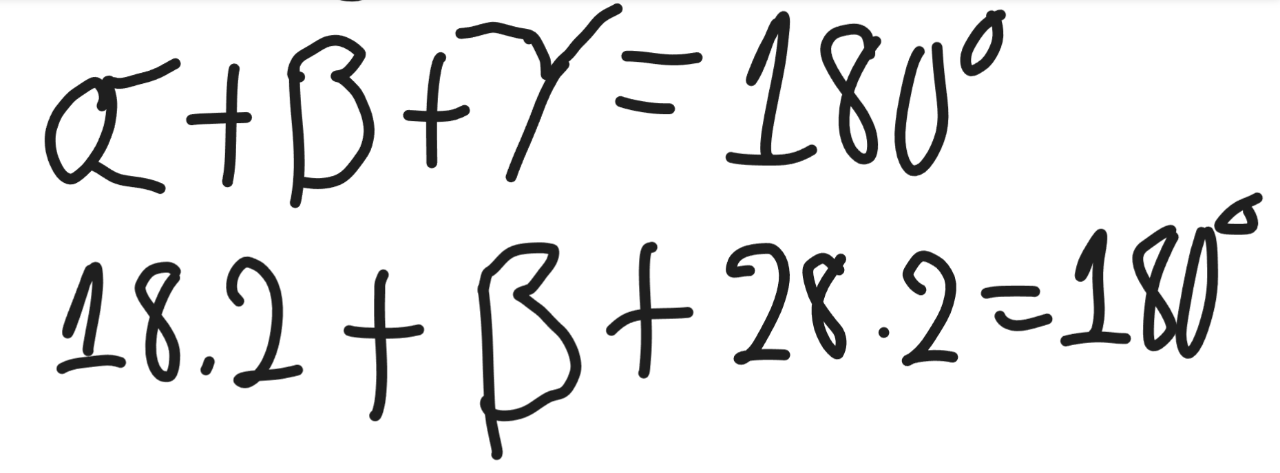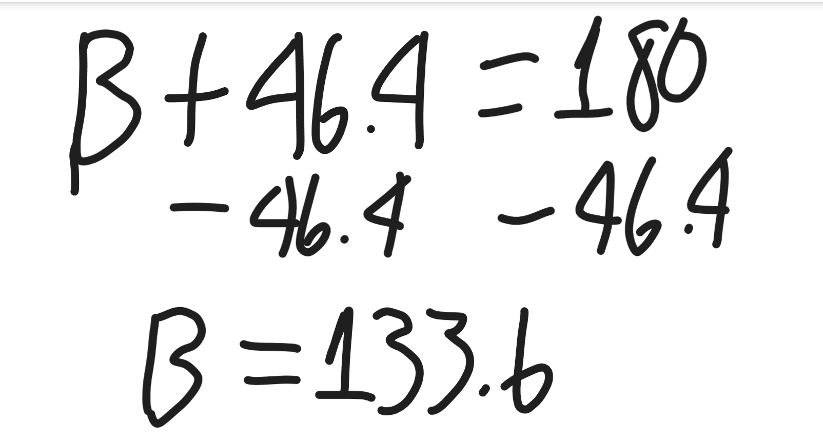 So here we're gonna combine the numbers: 2 + 28.2 = 46.4 So, the equation becomes: 46.4 + B = 180 Then, we're gonna isolate B: Subtract 46.4 from both sides of the equation: B = 180 - 46.4 Finally, Calculate the result: B = 133.6 Answer: The value of B (Beta) is 133.6