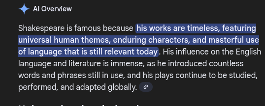 Shakespeare is famous because his works are timeless, featuring universal human themes, enduring characters, and masterful use of language that is still relevant today. His influence on the English language and literature is immense, as he introduced countless words and phrases still in use, and his plays continue to be studied, performed, and adapted globally.