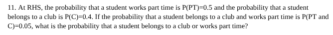 $$P(PT \text{ or } C) = 0.5 + 0.4 - 0.05$$$$P(PT \text{ or } C) = 0.9 - 0.05$$$$P(PT \text{ or } C) = 0.85$$