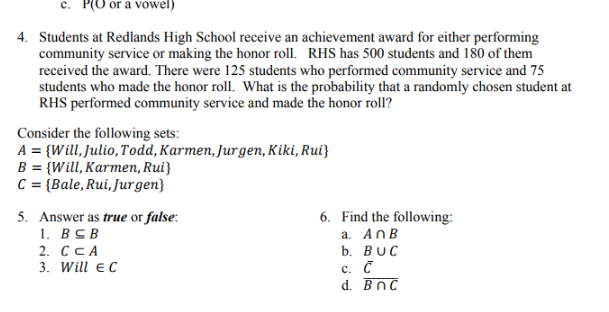 For #4: To find the number of students who did both (community service AND honor roll), we use the Inclusion-Exclusion Principle formula: First we're gonna identify the given values: Total students (N): 500 Students with award (A U B): 180 Community Service (A): 125 Honor Roll (B): 75 Now we're going to solve for the overlap: 180 = 125 + 75 - Both 180 = 200 - Both Both = 200 - 180 = 20 Now we're going to calculate the probability: P(Both) = 20/500 = 2/50 = 0.04 (or 4%) For #5: 1. True: Every set is a subset of itself. 2. False: While Rui and Jurgen are in A, Bale is not in set A. Therefore, C is not a subset of A. 3. False: Will is in sets A and B, but he is not listed in set C. For #6: 1. Since every person in $B$ is also in $A$, the intersection is just set B {Will, Karmen, Rui} 2. Combine all names from both lists, removing duplicates (Rui appears in both): {Will, Karmen, Rui, Bale, Jurgen} 3. Assuming set A (or the combination of all named students) is the universal set, we list the names in A that are not in C: {Will, Julio, Todd, Karmen, Kiki} 4. First, find B ∩ C: Only {Rui} is in both.The complement is everything in the group except Rui. {Will, Julio, Todd, Karmen, Jurgen, Kiki, Bale}