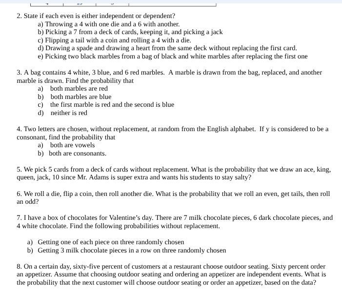 For #2: a) Throwing a 4 with one die and a 6 with another Independent (one die doesn’t affect the other) b) Picking a 7, keeping it, and then picking a jack Dependent (card not replaced) c) Flipping a tail with a coin and rolling a 4 with a die Independent d) Drawing a spade and then a heart without replacement Dependent e) Picking two black marbles after replacing the first Independent For #3: a) Both marbles are red: (6/13)(6/13) = 36/169 b) Both marbles are blue: (3/13)^2 = 9/169 c) First red, second blue: 6/13 x 3/13 = 18/169 d) Neither is red (white or blue both times): (7/13)^2 = 49/169 For #4: There's 26 total letters Vowels = A, E, I, O, U = 5 Consonants = 21 a) Both vowels: 5/26 x 4/25 = 2/25 b) Both consonants: 21/26 x 20/25 = 42/65 For #5: Number of hands in favor: 4^5 =1,024 Total 5-card hands: (52 5) = 2,598,960 Probability: 1024/2,598,960 = 64/162,435 For #6: Even then tails, then odd: 3/6 x 1/2 x 3/6 = 1/8 For #7: a) One of each: 7/17 x 6/16 x 4/15 = 7/170 b) Three milk chocolates: 7/17 x 6/16 x 5/15 = 7/136 For #8: P(outdoor) = 0.65 P(appetizer) = 0.60 So we'll use this formula: P(A∪B) = P(A) +P(B) − P(A)P(B) Then we'll plug in the numbers: 0.65 + 0.60 − (0.65)(0.60) = 0.86 So your final answer is 0.86