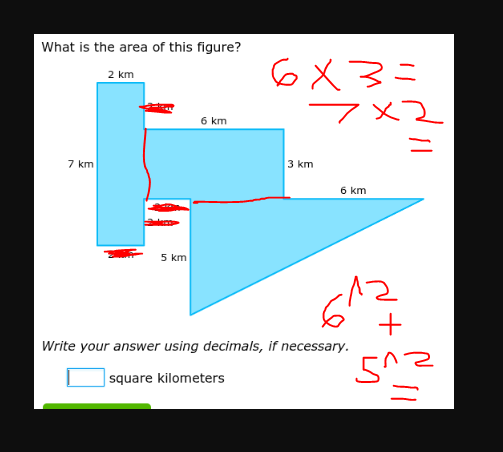 make box surrounding it - find the area of the voids (a2+b2=c2) for the triangles i think and uhhhh add the voids up from the total area of the square